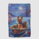 Set sail into the magic of the holiday season with this beautifully detailed illustration, showcasing a proud dog sitting in a festively decorated boat, gliding across a serene Christmas lake. The twinkling lights from nearby pine trees reflect off the water, casting a warm, festive glow that enhances the cosy ambiance. Ornaments dangle from the boat's sides, while glowing lanterns light the way, creating a scene that captures the true essence of Christmas warmth and joy. This nostalgic artwork brings a touch of holiday magic to any space, perfect for those who cherish the spirit of the season.