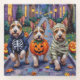 Adorable Biewer Terriers dressed in playful Halloween costumes carry pumpkin buckets while trick-or-treating under the moonlit sky. This festive design highlights the breed’s silky tri-coloured coat, playful charm, and affectionate personality, perfectly capturing the spooky yet fun atmosphere of Halloween night. A delightful celebration for dog lovers and Halloween fans alike.