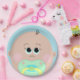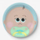 Blue baby shower paper plate, with graphics of a cute big cartoon face of a baby with a green pacifier. Customise to add your own text.