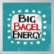 "Big Bagel Energy" is a cute text design in blue with black and red text, along with a white accent shape and white textured whimsical dots surrounding it.