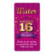 Here's a perfect label to put on a bottle of water or other favour for guests as a special thank you. This sweet sixteen thank you label is reminiscent of a concert or circus poster. A medallion encloses the golden words "Sweet 16" atop of a pink burst background. The word "Water" is written above and the birthday girl's name stands out below in the bright purple banner. Add a special message below. Makes a water bottle a fun and useful giveaway. Available with matching products.