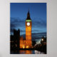 The clock tower at the east end of the Palace of Westminster (better known as the Houses of Parliament) is commonly known as Big Ben, although this is actually the name of the bells that chime every quarter hour. It is a world famous icon of London, and the area around is always busy with with tourists enjoying the view and photographing the elegant gothic styled structure. This photo is taken from the south bank, looking across the River Thames, at dusk. The lighting on the building gives the stonework a rich gold tint and the tower is outlined is outlined against the deep blue of the sky at dusk. sky.