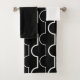 This towel set has a white washcloth, a black hand towel, and a bath towel with an art deco design of white half circles connect with lines on a field of black.