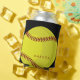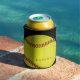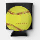 A purple can cooler featuring a huge softball in frame. Towards the bottom is a spot for yours or your gift recipients name or initials.