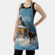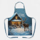 Beautiful 12 point buck on a quiet snowy evening standing in front of a log cabin home with small twinkle lights in the trees an a homey lighted porch.