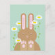 A bug bunny sitting in the flowers with Happy Easter in his ears.