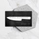 An oversized, graphic white chef's knife contains your name or business name for an eye-catching logo on this modern business card design. The background is a subtle, black woodgrain texture. Perfect for personal chefs, catering businesses, restaurants, food trucks, food writers and more! © 1201AM CREATIVE