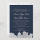 Big City skyline silhouette wedding invitation accented with blue. Customise text to suit your style.