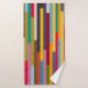 This towel set has a pink washcloth, a periwinkle hand towel, and a bath towel with a geometric design of colourful stripes running vertically.