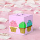 Party favour box with cupcakes and custom text. Lavender pink colour with big cupcakes drawn around the sides. Script text on top to thank friends for coming to the party.