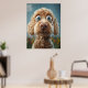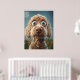 A hilariously adorable Australian Labradoodle with curly fur and huge, expressive eyes, looking surprised in a colourful outdoor setting.