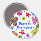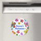 Kid’s artwork magnet for the fridge. Personalise with her name and use to hold special drawings or schoolwork. Bright and colourful hand-drawn flowers surround a text template in the centre. Magnets come as round or square.