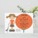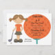 Start your celebration off with this adorable golf party invite. It is for a girls golfing party. it features a brunette haired girl standing next to a large orange golf ball. The party info is written on the gold ball, which is on a tee. Look for the many other products in this line. ©Jessica Weible Illustrations