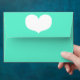 NewParkLane - Romantic Greeting Card Envelope in trend teal, with a white heart, on both front and back. Inside a pattern of teal hearts.