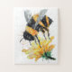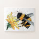 traditional watercolor artwork of a big black and yellow bee collecting pollen from a yellow flower as a jigsaw puzzle
