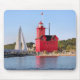 A vivid red lighthouse in Holland, Michigan, stands out against the blue water and sky as a sailboat glides by, enhancing the serene coastal atmosphere