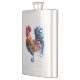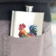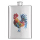 traditional watercolor artwork of a big rooster with lots of colourful feathers on its wings and tail on a flask.