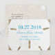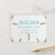 Big, white sand dollar wedding announcement postcard. Sparkling water at the shore background shows through the holes in a realistic sand dollar image. Customise three lines of blue text on the front, and add more information to the back for a tropical, beach destination wedding event.