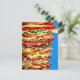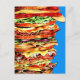 This design features a coloured pencil drawing of a huge sandwich, stacked to overflowing with cold cuts, lettuce, onions and tomatoes.