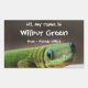 A colourful green gecko smiles at the camera on a large rectangular sticker. Fun for an eye-catching design on name badges for reunions, conventions or meetings. Delete the "Wilbur Green"/Text 2 area prior to purchase. Use a bright, light coloured permanent marker to fill in the names of the people as they check in. The special occasion title or name of company can be pre-printed, using the template line shown here as "from Florida Office"