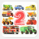 Nine bright colourful trucks surround a great big number 2! Add your own age! A green and yellow cement mixer, blue pick up truck, yellow bulldozer, orange dumper truck, red road roller, green tractor and trailer, big red firetruck, yellow digger and a builder's red truck! All kinds of transport, the big trucks that kids love! Perfect for your fire truck, digger, truck or tractor mad 2 year old on his or her 2nd Birthday. Wonderful for your 2yr old's Truck Themed Birthday Party. Great Truck Stickers for Truck Themed Party Favours or Party Bags. Kids love Firetrucks, Trucks, Diggers and Tractors and two year olds love trucks most of all!