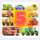 Celebrate your Fifth Birthday Party with these amazing Custom Birthday Big Trucks Party Stickers! Nine bright colourful trucks surround a great big number 5! Add your own age! A green and yellow cement mixer, blue pick up truck, yellow bulldozer, orange dumper truck, red road roller, green tractor and trailer, big red firetruck, yellow digger and a builder's red truck! All kinds of transport, the big trucks that kids love! Perfect for your fire truck, digger, truck or tractor mad 5 year old on his or her 5th Birthday. Wonderful for your 5yr old's Truck Themed Birthday Party. Great Truck Stickers for Truck Themed Party Favours or Party Bags. Kids love Firetrucks, Trucks, Diggers and Tractors and five year olds love trucks most of all!
