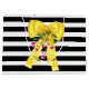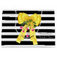 Stylish gift bag done in a bold black and white horizontal stripe pattern. Graphic artwork of a big yellow satin looking bow, with pink berries hanging down, decorates the middle front and back of the bag. Personalise the text, on the front, to read what you want.