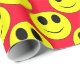 Big Yellow Smiley Allover-really is exactly as it's title. Not much description is needed.The large yellow smiley face with black slightly beveled eyes and a smiley mouth. A black rim circles the edges. The smiley has been reduced in sized and tiled to create an allover background pattern. The background is bright red. The big yellow smiley design is available with assorted background colours. Coordinating party supplies is available. You choose the gift wrap style, glossy or matte. You choose the size roll you need.