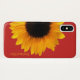 Elegant iPhone X case done in red with graphics of a large yellow and brown sunflower peeking over the left side. Personalise the yellow text for yourself or as a great gift idea.