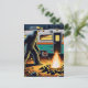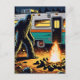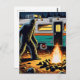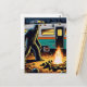 Postcard with an ai illustration of a bigfoot or sasquatch hanging out by a campfire in front of an old vintage retro rv done in a hyper realistic comic book style cartoon.
