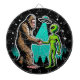 This whimsical image illustrates a friendly encounter between two legendary beings: Bigfoot and an alien. The scene, set against a starry night sky with silhouettes of pine trees, shows Bigfoot and the alien shaking hands under the beam of a UFO hovering above. Bigfoot, covered in brown fur, stands on the left while the green, humanoid alien with a large head and black eyes stands on the right. The combination of these iconic figures in a peaceful meeting adds a playful twist to both myths, making it a fascinating and humourous piece for enthusiasts of the unexplained.