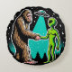 This whimsical image illustrates a friendly encounter between two legendary beings: Bigfoot and an alien. The scene, set against a starry night sky with silhouettes of pine trees, shows Bigfoot and the alien shaking hands under the beam of a UFO hovering above. Bigfoot, covered in brown fur, stands on the left while the green, humanoid alien with a large head and black eyes stands on the right. The combination of these iconic figures in a peaceful meeting adds a playful twist to both myths, making it a fascinating and humourous piece for enthusiasts of the unexplained.