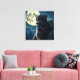 Bigfoot canvas art. A Sasquatch with golden glowing eyes with an owl on his shoulder with a Full Moon forest background in shades of blue.