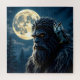 Bigfoot acrylic art. A Sasquatch with golden glowing eyes with an owl on his shoulder with a Full Moon forest background in shades of blue.