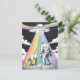 A funny Bigfoot and a unicorn looking up at a UFO that is beaming down rainbow light