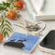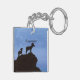 A watercolor painting of bighorn sheep silhouetted on a cliff adorns this customisable keychain!
