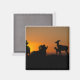A small herd of bighorn sheep settle down for the night. Their silhouettes stand against the blazing sunset behind them. Computer art by Kathie Miller.