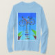 A bicycle is uniquely displayed atop a tall metal pole with attached glass bottles. The vibrant blue and red colour scheme contrasts with the clear sky.