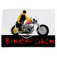 BIKER CHICK wearing all black and adorned with metal chains, dark shades and, of course, leaning against her motorcycle. For apparel, the BIKER CHICK is facing forward on the front and facing backwards on the back.