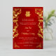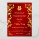 This traditional Chinese wedding invitation features a golden Asian frame, gold cherry blossoms and a golden artistic double happiness symbol on a shimmering red background. With a traditional Chinese text at the backside. This version has the parent's names in the headline.