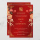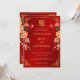 This traditional Chinese wedding invitation features a golden Asian frame, red, peach and cream coloured peonies and a golden artistic double happiness symbol on a shimmering red background. With a traditional Chinese text at the backside.