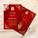 This traditional Chinese wedding invitation features a real gold foil double happiness symbol, Chinese peony flowers and a real gold foil text in a handwritten script and a modern sans serif font. At the backside is at traditional Chinese text, a matching faux gold foil double happiness symbol and a traditional golden frame.