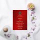 This minimal Chinese wedding invitation features a real gold foil double happiness symbol on a floral ruby red shimmering background. Bride and groom names in an elegant handwritten script. Chinese wedding invitation or tea ceremony invitation. With a traditional Chinese text at the backside.