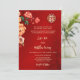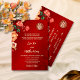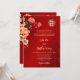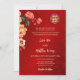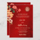 This traditional BILINGUAL Chinese Wedding Invitation. Red, orange and yellow peony flowers with a red shimmering background. Chinese wedding invitation with a golden double xi happiness symbol. At the backside is a custom traditional Chinese text.