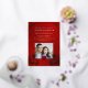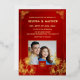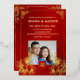 This elegant Chinese wedding invitation features a photo, a gold foil Chinese frame and round gold double happiness symbol and gold foil flowers on a floral ruby red shimmering background. With a traditional Chinese text at the backside. Chinese wedding invitation or tea ceremony invitation.