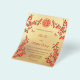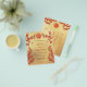 Red cherry blossom branches and two butterflies on a gold background. Traditional Chinese wedding invitation with a red double happiness symbol. With a traditional Chinese text template at the backside.