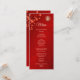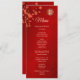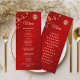 Red cherry blossoms and a gold double happiness symbol on a shimmering red background. With custom bride and groom names, the wedding date and a custom menu text. On the backside is a traditional Chinese text.