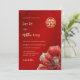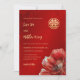 A red flowers on a shimmering red background. Traditional Chinese wedding invitation with a red double happiness symbol. With a traditional Chinese text template at the backside.