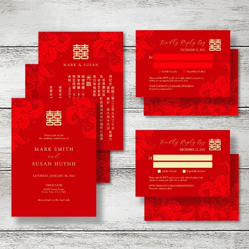 Bilingual Vietnamese English Red Floral Wedding Invitation