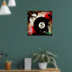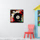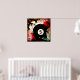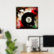 A grungy design of the cue ball behind a Billiards 8 ball.